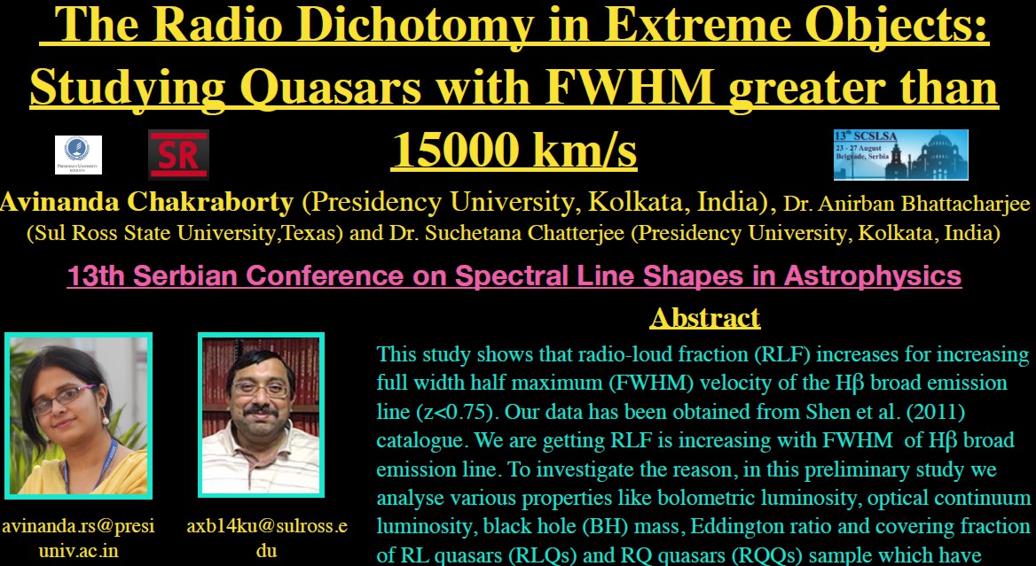 | P02 | | Avinanda Chakraborty | The radio dichotomy in extreme objects: Stutying quasars with FWHM greater than 15000 km/s |