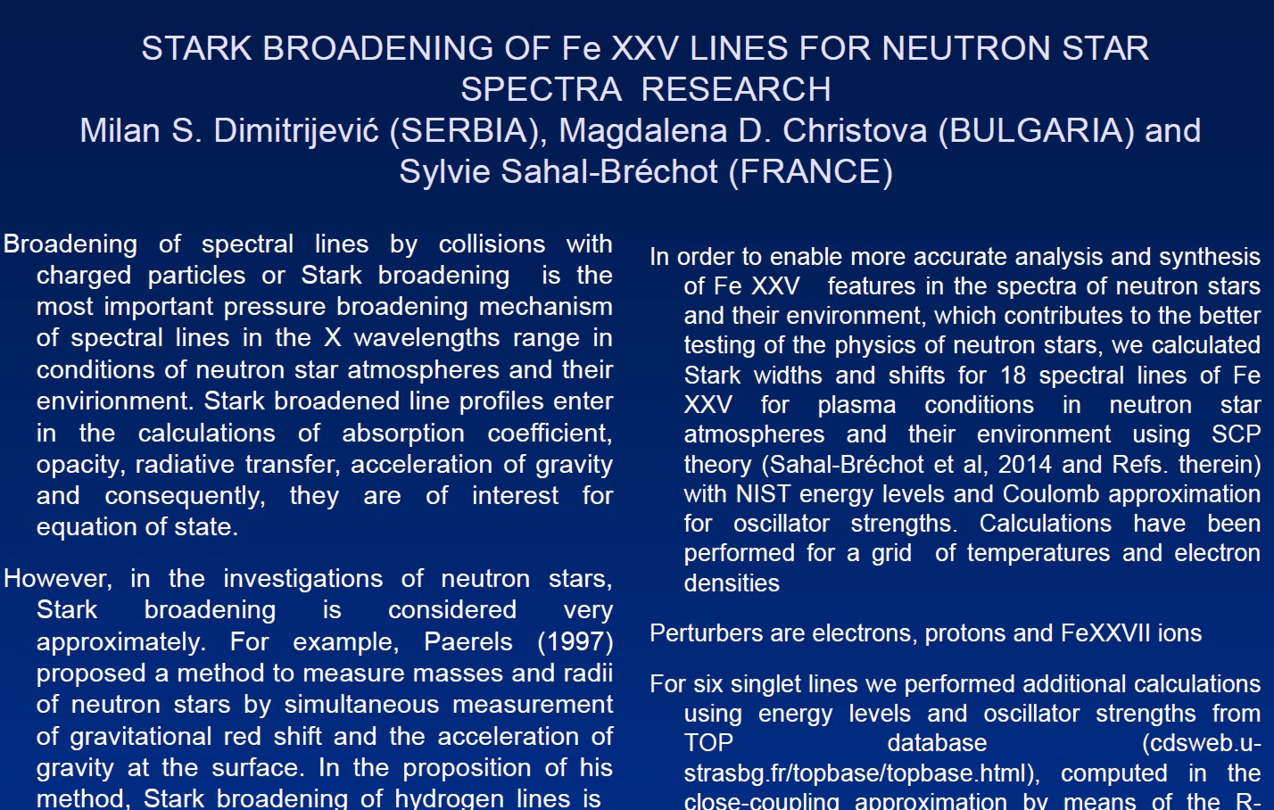 | P04 | | Milan S. Dimitrijević, Magdalena D. Christova, Sylvie Sahal-Brechot | Stark broadening of Fe XXV lines for neutron star spectra research |