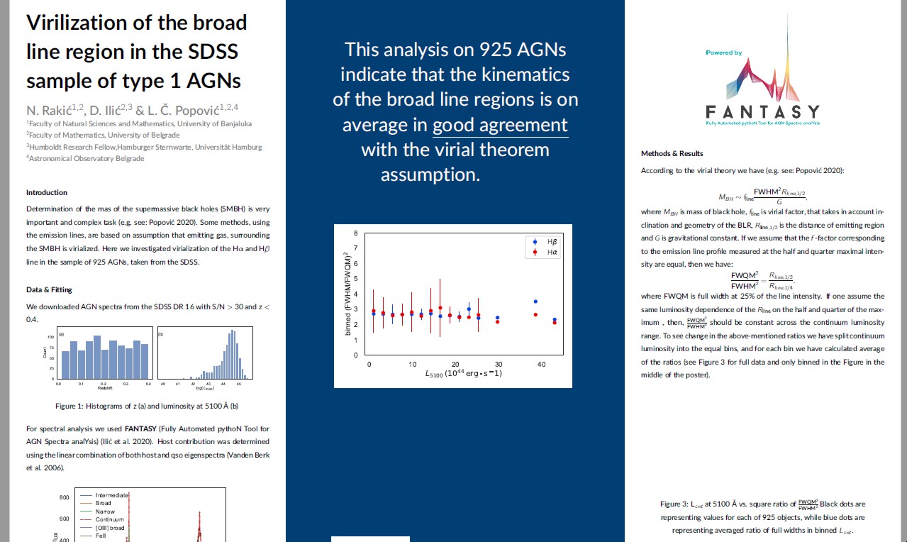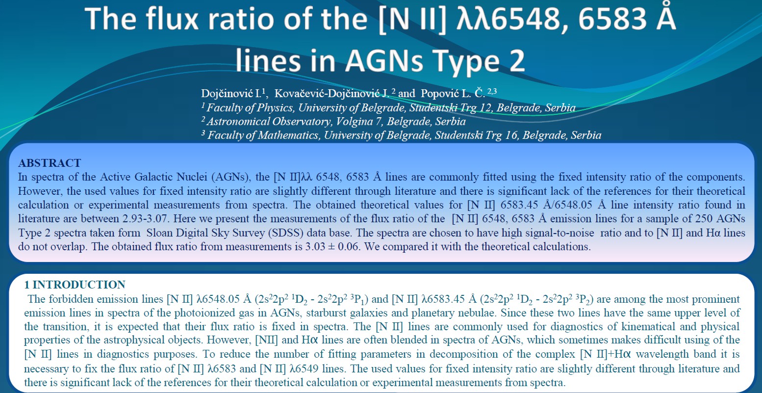 | P05 | | Ivan Dojčinović, Jelena Kovačević-Dojčinović, Luka Č. Popović | The flux ratio of the [N II] 6548, 6583 a lines in sample of AGNs type 2 |