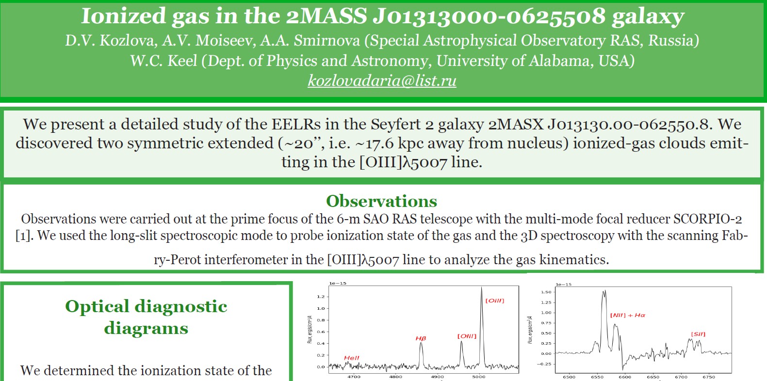| P19 | | Daria V. Kozlova, Alexei V. Moiseev, A.A. Smirnova | Ionized-gas clouds in the 2MASX J013130.00-062550.8 galaxy |