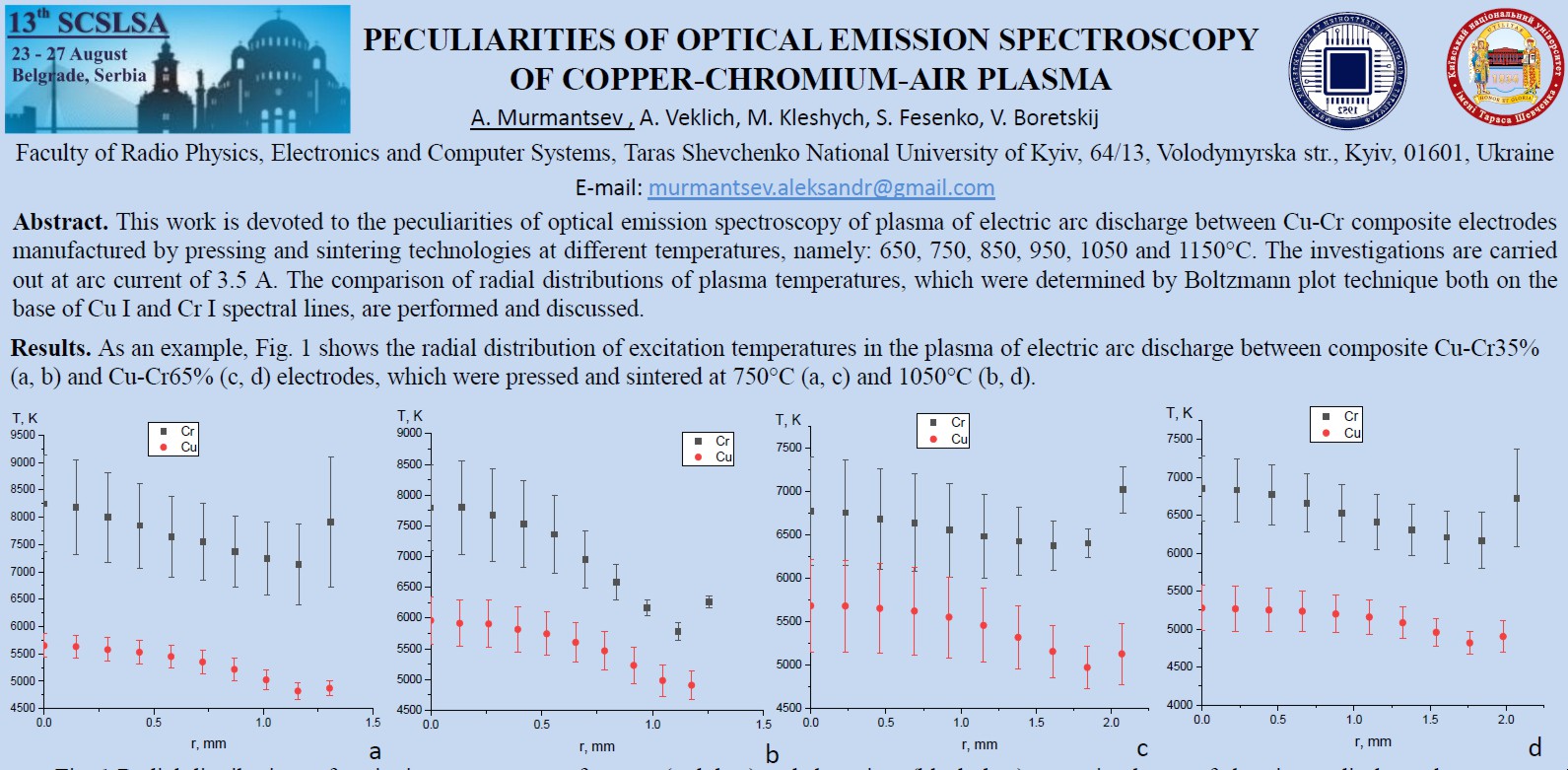 | P10 | | Aleksandr Murmantsev, A. Veklich, M. Kleshych, S. Fesenko, V. Boretskij | Peculiarities of optical emission spectroscopy of copper-chromium-air plasma |