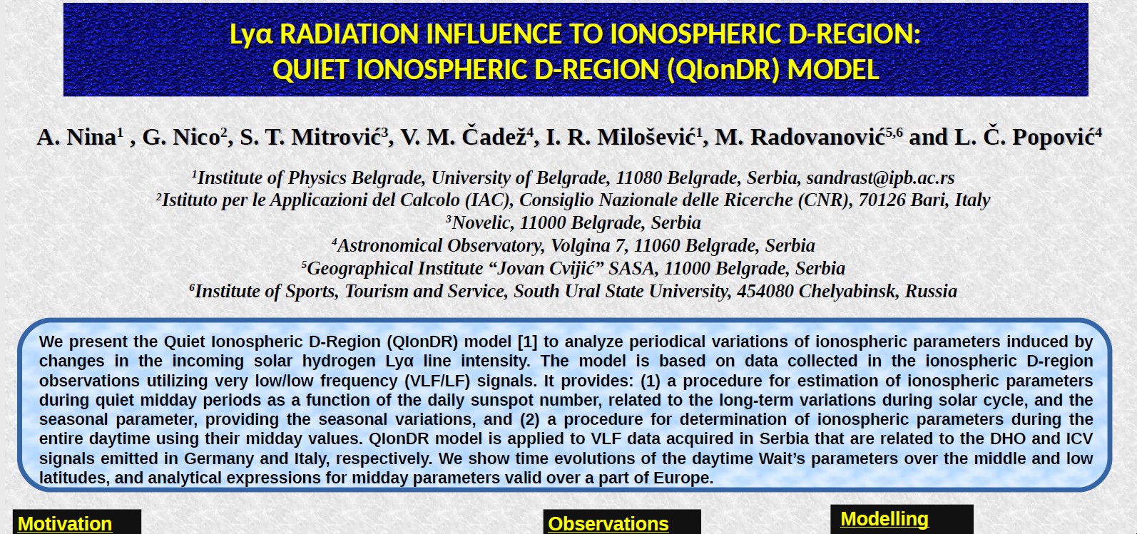 | P11 | | Aleksandra Nina, G. Nico, S. T. Mitrović, V. M. Cadež, I. R. Milošević, M. Radovanović, L. Č. Popović | Lya influence to ionospheric D-region: quiet ionospheric d-region (QIONDR) model |