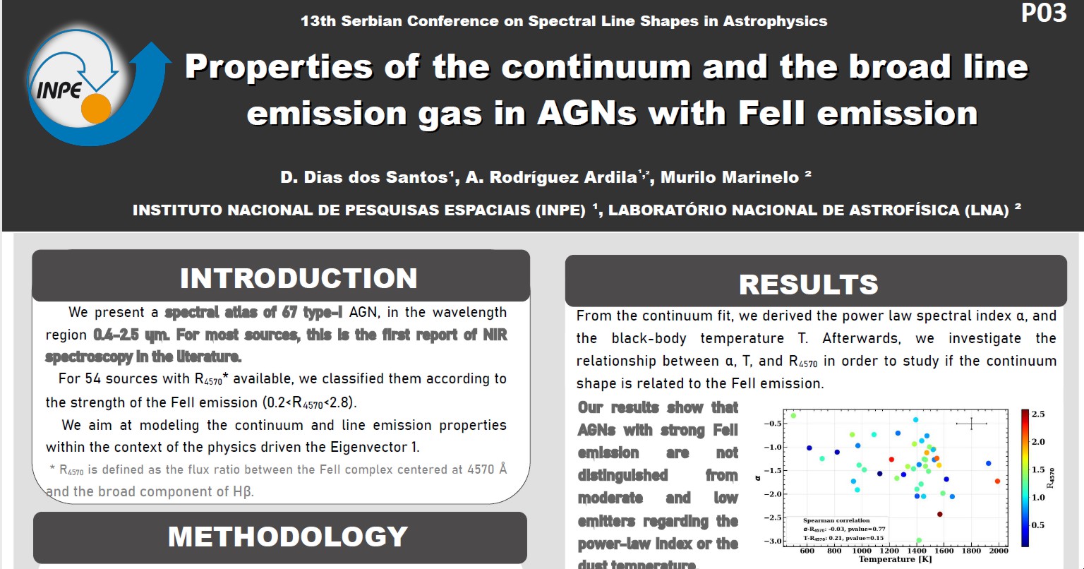 | P03 | | D. Dias dos Santos, A. Rodriguez-Ardila, M. Marinello | Properties of continuum and broad line emission gas in AGNs FeII emitters |