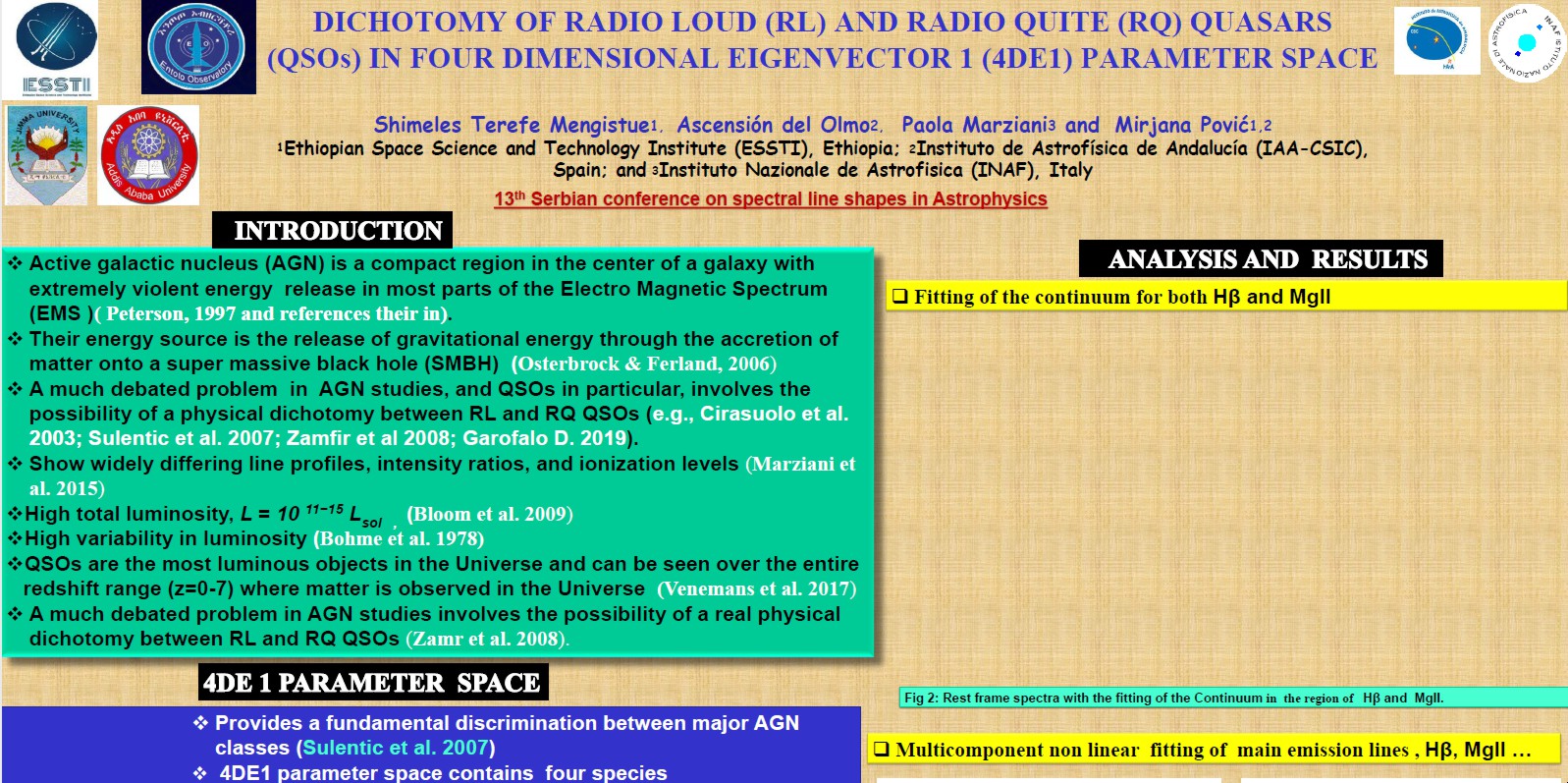 | P17 | | Shimeles Terefe, Ascension Del Olmo Orozco, Paola Marziani, Mirjana Pović | Dichotmy of Radio Loud (RL) and Radio Quite (RQ) Quasars In Four Dimensional Eigenvector 1 (4DE1) Parameter Space |