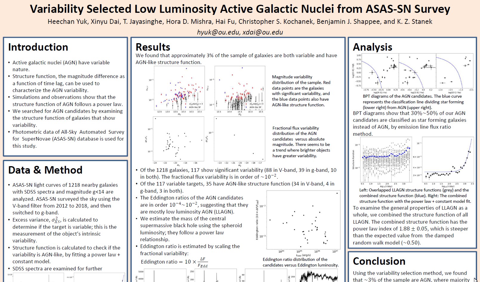 | P18 | | Heechan Yuk, Xinyu Dai, T. Jayasinghe, Hora D. Mishra, Hai Fu, Christopher S. Kochanek, Benjamin J. Shappee, and K. Z. Stanek | Variability Selected Low Luminosity Active Galactic Nuclei from ASAS-SN Survey |